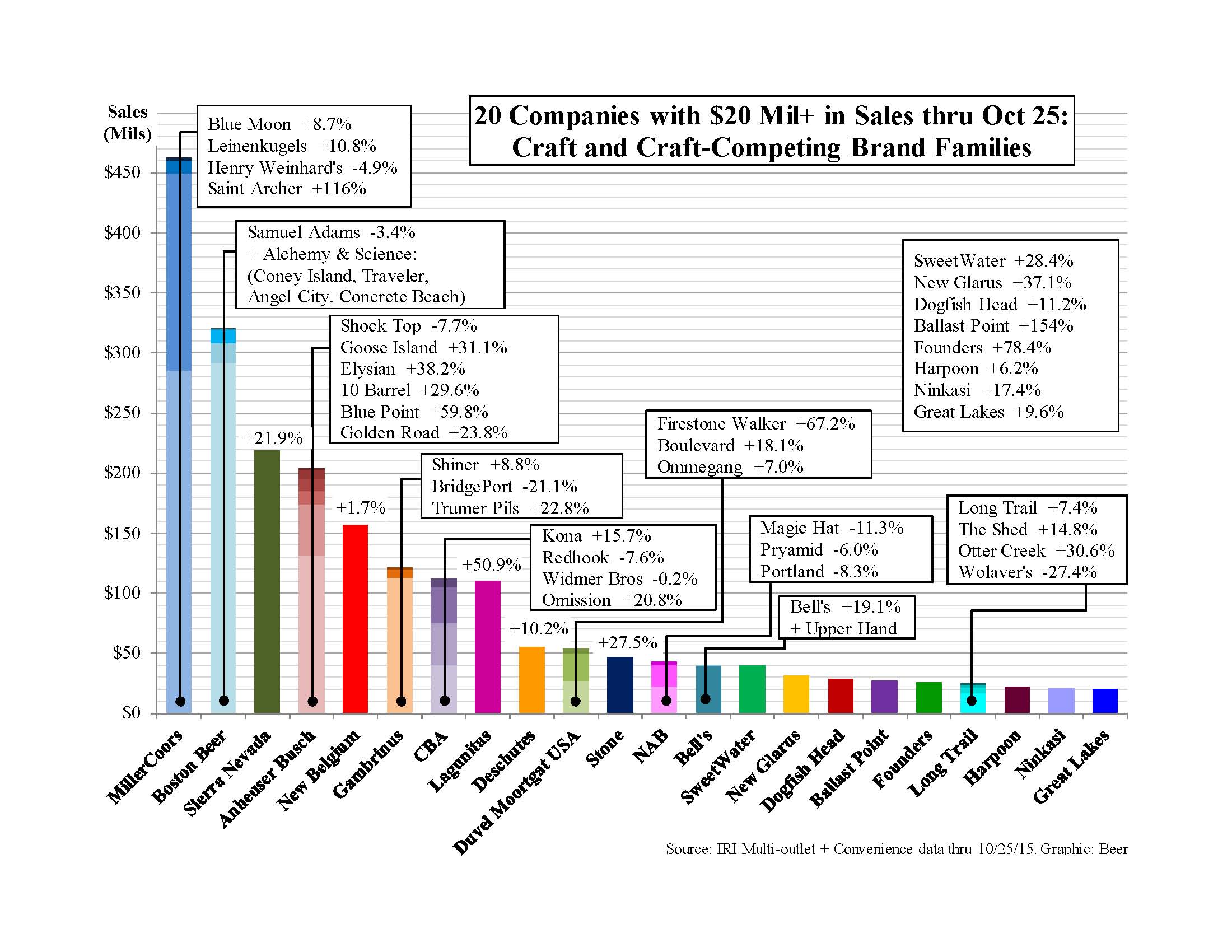 Constellation Gets "Crown Jewel" With this deal, Constellation instantly catapults itself into major leagues as a craft player, buying "literally the crown jewel of craft," Constellation ceo Rob Sands told INSIGHTS. It is "by far the fastest growing major craft brewer." Indeed, Ballast Point is more than doubling in 2015. It sold 123,000 bbls last yr and expects to sell about 4 mil cases, or 280,000 bbls in 2015. That's growth of about 128% and would mean Ballast Point would jump from #27 to very near our top 10 in list of craft brewers. Like Lagunitas, it will no longer be part of Brewers Assn list of craft brewers starting with 2016 data. That list has suffered a couple of body blows this yr. Between those 2 brewers, it will lose 1.1 mil bbls of fast-growing craft volume, over 5% of 2015 segment volume and about 15-20% of its 2015 growth.