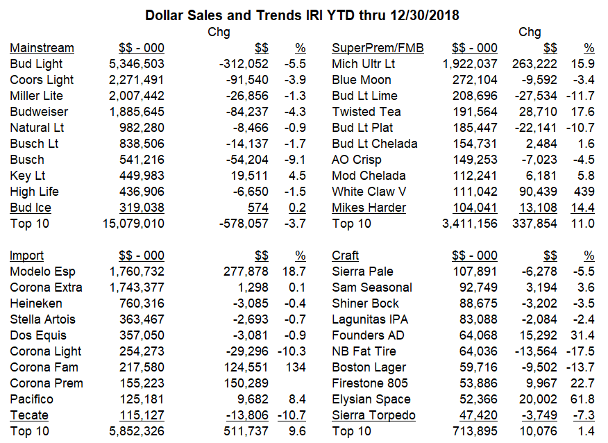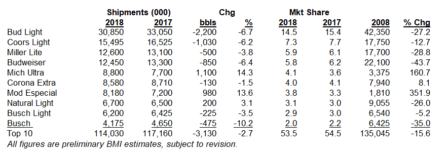 Two big winners in top 10 each gained about 1 mil bbls, 14% in 2018. Michelob Ultra tacked on another 1.1 mil bbls last yr, we estimate, passing Corona Extra for #5 spot. Modelo Especial closing on portfolio-mate Extra as well (it passed Corona Extra in off-premise scans). Especial up another 980K bbls, 13.6%. Corona Extra dipped 1.5% as Familiar and Premier cut into its volume. Even so, and with Corona Light suffering near-double digit decline, Corona franchise expanded by over 1 mil bbls, over 10%. Natty Light posted its first gain since 2009 as its avg prices dipped about 45 cents/case in scan data. Busch Light down 3-4%, but Busch suffered a double-digit decline.