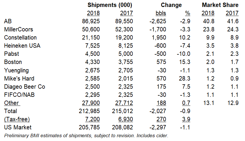 With AB and MC each down about 3% for 9 mos, and no signs of improvement (Oct-Dec scans softer), top 2 collectively dropped another 4.3 mil bbls or so in 2018, we estimate. That’s a big hole at the top. Gainers could not offset. (Recall, Constellation believes it will be another few yrs before high-end growth offsets mainstream loss and industry turns positive.) AB share dipped below 41, we figure, down from peak of just below 50 over a decade ago. At same time, AB shed about 20 mil bbls since peak volume in year InBev bought it, 2008. MC dropped nearly 14 mil bbls same period. JV’s peak volume was same yr it formed. MC hasn’t scored up yr since, AB just one. Constellation blew past 21 mil bbls with nearly 2-mil-bbl, 10% gain again in 2018, its 5th straight in double-digitrange while total biz treaded water. Constellation over 10 share of US-only shipments.