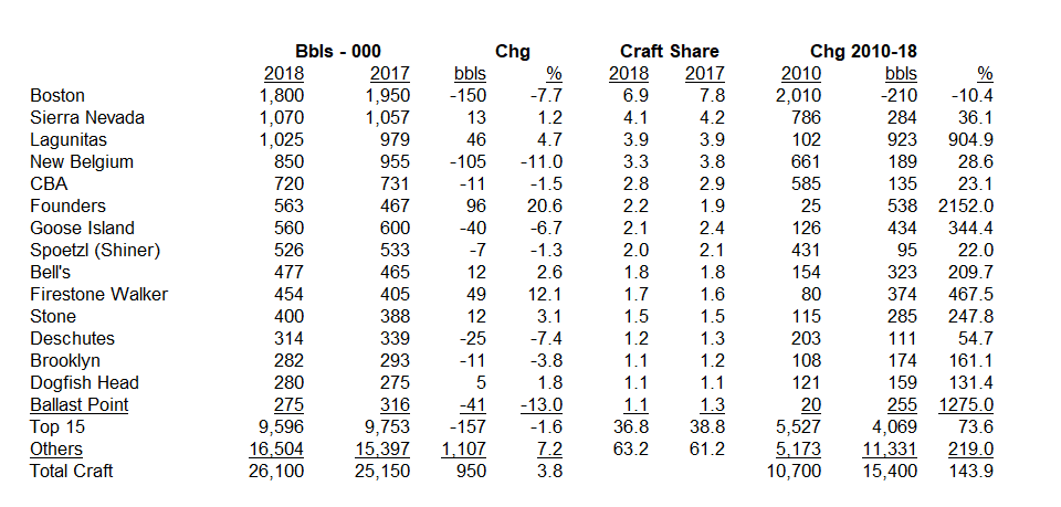 Eight of Top-15 Craft Brewers, 3 of Top-5 Flat-to-Down It ain’t easy being a top-tier craft brewer. Of top 15 craft players, 8 ended 2018 flat or down, including 3 of top-5, 5 of top-10. Boston Beer’s beer (mostly Sam Adams) declined 8%, we estimate, even as total co likely up about 15% (suggests Boston’s craft biz shrunk to just 42% of its volume). Sierra Nevada up just 1.2% to 1.07 mil bbls. New Belgium took tuff 11%, 100K-bbl shipments hit. After growing 880K bbls over 7-yr span, Lagunitas finished flattish in US last yr, we estimate. But co cracked 1 mil bbls, +5%, including bustling intl biz up 90%. CBA and Shiner each dipped low-single-digits, while Deschutes and AB’s Goose Island each off high singles and Constellation’s Ballast Point declined double-digits for 2nd straight year. So, top indie brewers and big brewer partners alike struggled in segment.