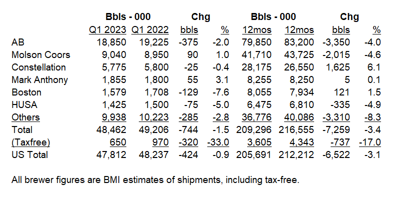 Beer shipments remained soft in Q1, tho much improved vs big drops thruout 2022. US shipments slipped a little less than 1%, INSIGHTS estimates based on Beer Inst, TTB and US Dept of Commerce data. Total shipments softer including steep export drops as top brewers are seemingly shifting more production of international volume to mkts outside the US.