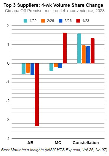 AB shed 3.3 share of beer industry volume to 39.7 for 4 wks thru Apr 23 in Circana multi-outlet + convenience data. Based on 9.4% decline, AB's 4-wk share loss was 5-7x its 0.5-0.6-pt dips in prior periods (see chart below). Molson Coors went from losing 0.2-0.4 share of volume to picking up 1.6 share last 4 wks, hitting 22.4 share on 5.9% volume gain. And Constellation picked up more share than it had been, +1.3 to 14.4 share as volume jumped 8.1%. By $$, AB off 5.4%, while MC almost matched Constellation's growth rate, +11.5% and +12.4%, respectively. In fact, if MC had shed same 0.2 share of $$ it lost the prior 4-wk period thru 3/26, Constellation would've passed it to be #2 brewer by $$ in scans.