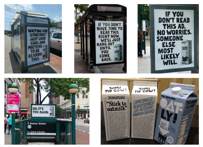 Making first appearance at Natl Restaurant Assn Show as its product is increasingly embraced by foodservice channel, Swedish oatmilk pioneer Oatly brought along packages that devote extensive real estate to brand’s garrulous voice even as streets outside convention center were palette for extensive outdoor campaign that breaks into commuters’ reveries with reminder to check out oatmilk leader. The campaign breaking along commuter pathways not just in Chicago but also in NY, LA and SF offers 387 unique pieces of creative inserted into transit nooks and crannies “where you’d not likely not be thinking about oatmilk,” said Emily Keene, co’s US media & digital lead. Beyond those cities, Oatly will reach consumers online via video campaign on YouTube and Hulu that feature co’s distinctive cartons being brought home in unusual ways, say, strapped to pogo stick. Under US gm Mike Messersmith, all creative continues to be devised and executed in-house, then lobbed to media buyer PHD to meet co’s clever but peculiar directives, such as for separate ads on facing pages in magazines (BBI, Apr 3).