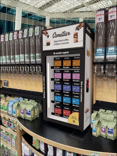 But the more crucial pilot, as it turns out, has been at about 10 Sprouts Farmers Market stores in Southern Calif, starting last Oct that’s now being expanded to 100 stores. In contrast to acquiescing with a freezer presence, mitigated with freezer door clings and in-store sampling, Cometeer has taken a cue from Freshpet by installing branded freezers right in the heart of the coffee section. Cometeer fortuitously was able to find units that were precisely the size of disused grinding machines placed among the whole-bean dispensers.