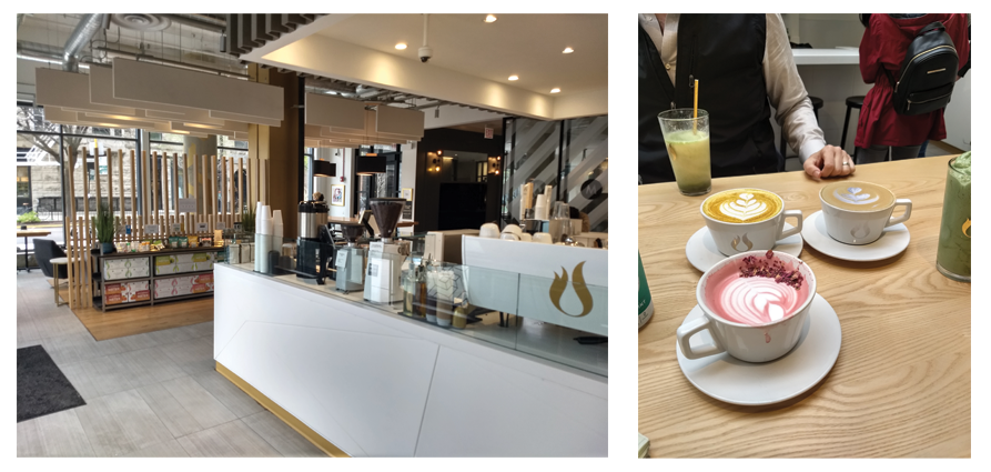 Matros and his partner Jeff Shapack were prescient enough to acquire some of real estate in 2014, building 2,500-sq-ft flagship store on part of it and partnering with Lettuce Entertain You to open Asian restaurant on other. Flagship store has been designed to accommodate work-from-home crowd, with outlets everywhere, whiteboard and TV screen for presentations; Pepsi and Sara Lee are among companies that have hosted events there and mayor-elect Lori Lightfoot kicked off her campaign there. A coffee roaster behind transparent screen in back was recently removed to accommodate next phase, which Matros wasn’t ready to discuss yet.
