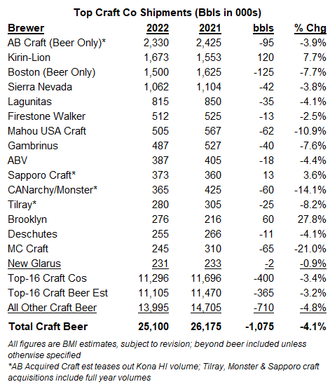 Craft beer shipments declined somewhere between low-to-mid single-digits in 2022, available data and current estimates suggest. Still waiting on final 2 mos of TTB reports and potential TTB revisions (as has been customary to large degrees the past coupla yrs). But combo of Beer Inst estimates, TTB and US dept of commerce data estimates, plus BMI estimates currently put total industry shipments down ~3.5% for the year. Tuff to say craft gained share in 2022.