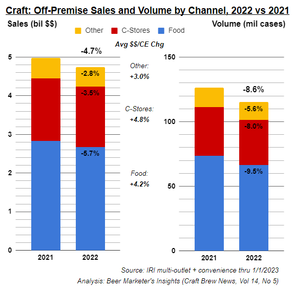Lots of craft brewers are happy to close the book on 2022, especially when it comes to tough off-premise environment. Craft volume finished the year down 8.6% in IRI multi-outlet + convenience data, with $$ off 4.7%. Biggest hit came in foodstores, where craft volume fell 9.5%. Segment shed 0.9 share of beer category $$ to 20 on 5.7% decline in the channel. C-stores still far less developed and not that much better: craft cases down 8%, volume -3.5%. Craft not quite so soft at all other off-premise outlets tracked in IRI MULC data (drug, mass market/Walmart and more), but still down mid-single-digits by both volume and $$.