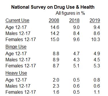 Just as the extensive Monitoring the Future and Youth Risk Behavioral System surveys indicated a slowdown or pause in the decades-long decline in teen drinking rates, so does the recently released National Survey on Drug Use and Health (NSDUH) from the federal government. The table below shows drinking rates among younger teens, age 12-17, comparing rates for 2008, 2018 and 2019. After falling sharply over the 2008-2018 period, rates of current drinking (past month), binge drinking (5+ drinks on at least one occasion in past month) and heavy drinking (at least 5 binges over the previous 30 days) stalled or reversed in 2019.